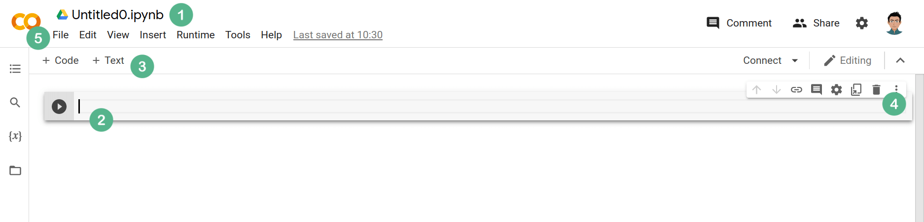 The most commonly used features of the Google Colab notebook web interface are described below, cross-referenced using the numbers in the image in section 1.3.2 above.