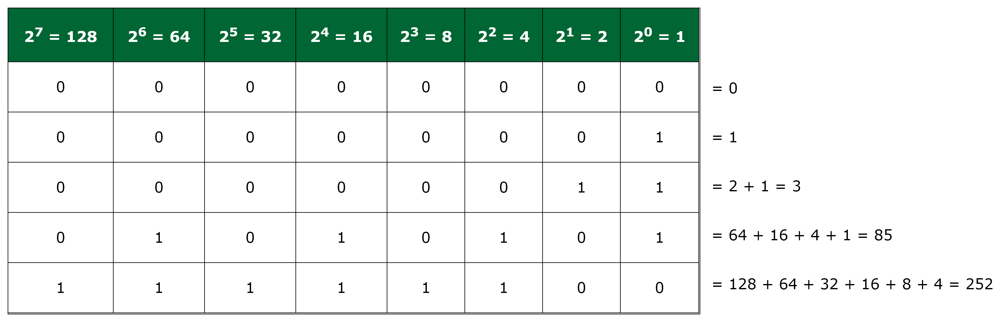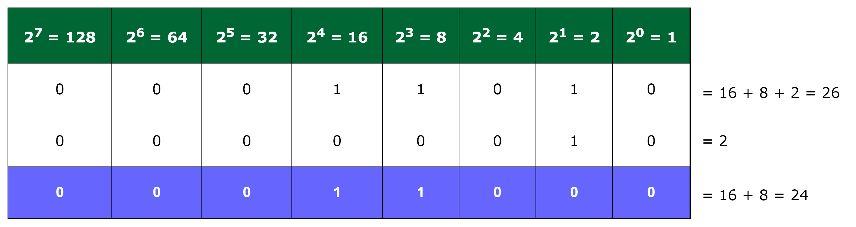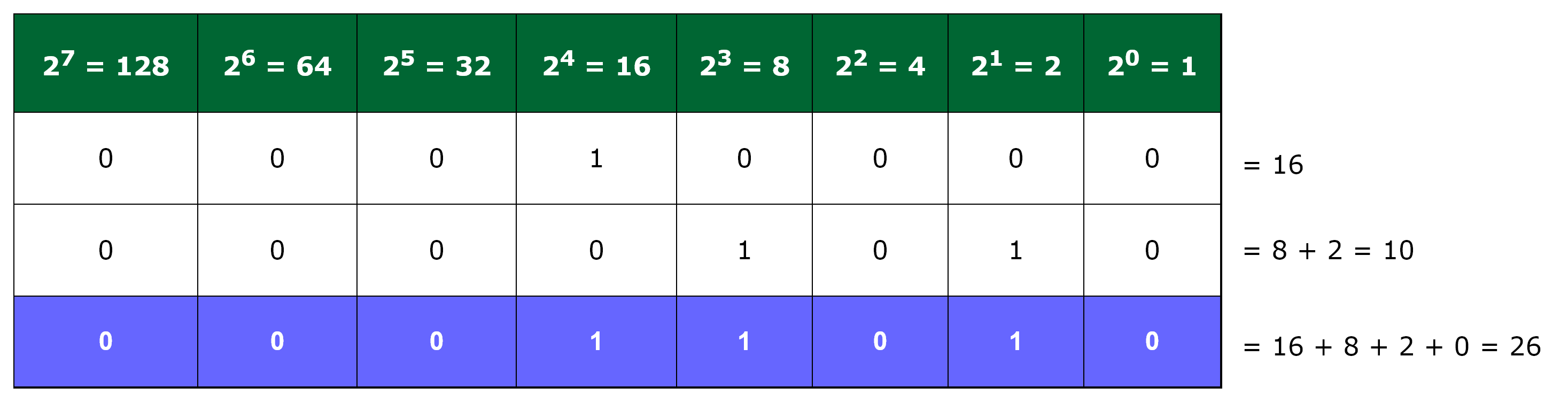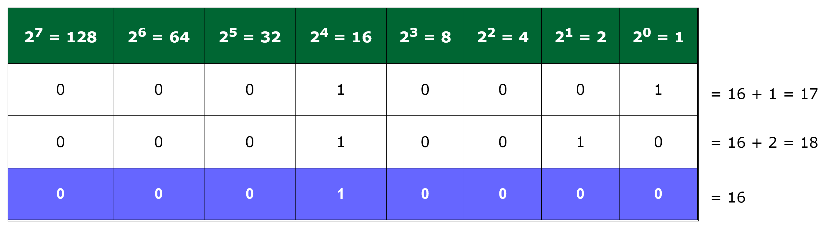Using this table, any integer value can be represented as a series of bits, where the only possible value for each cell is either 1 or 0. Once the bits have been set, simply add those columns where the bit value is 1 to get your number, as follows: