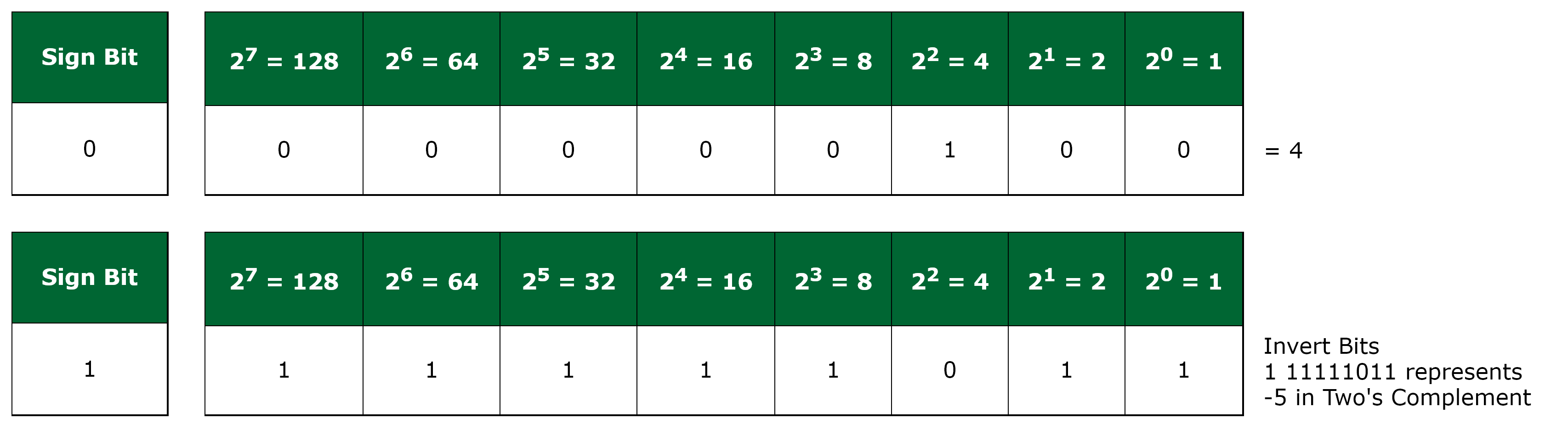 You may now be wondering how you are able to look at 111111011 and know that it represents -5 i.e. go from Two's Complement to decimal. To compute this reverse computation, either perform Two's Complement again on 11111011 which gives you 00000101 = 5, and with the sign bit gives you -5. Equivalently, you can compute the decimal value of 11111011 = 251 and substract 28 = 256 (2 to the power of the number of bits without the sign bit) from this to give you -5.