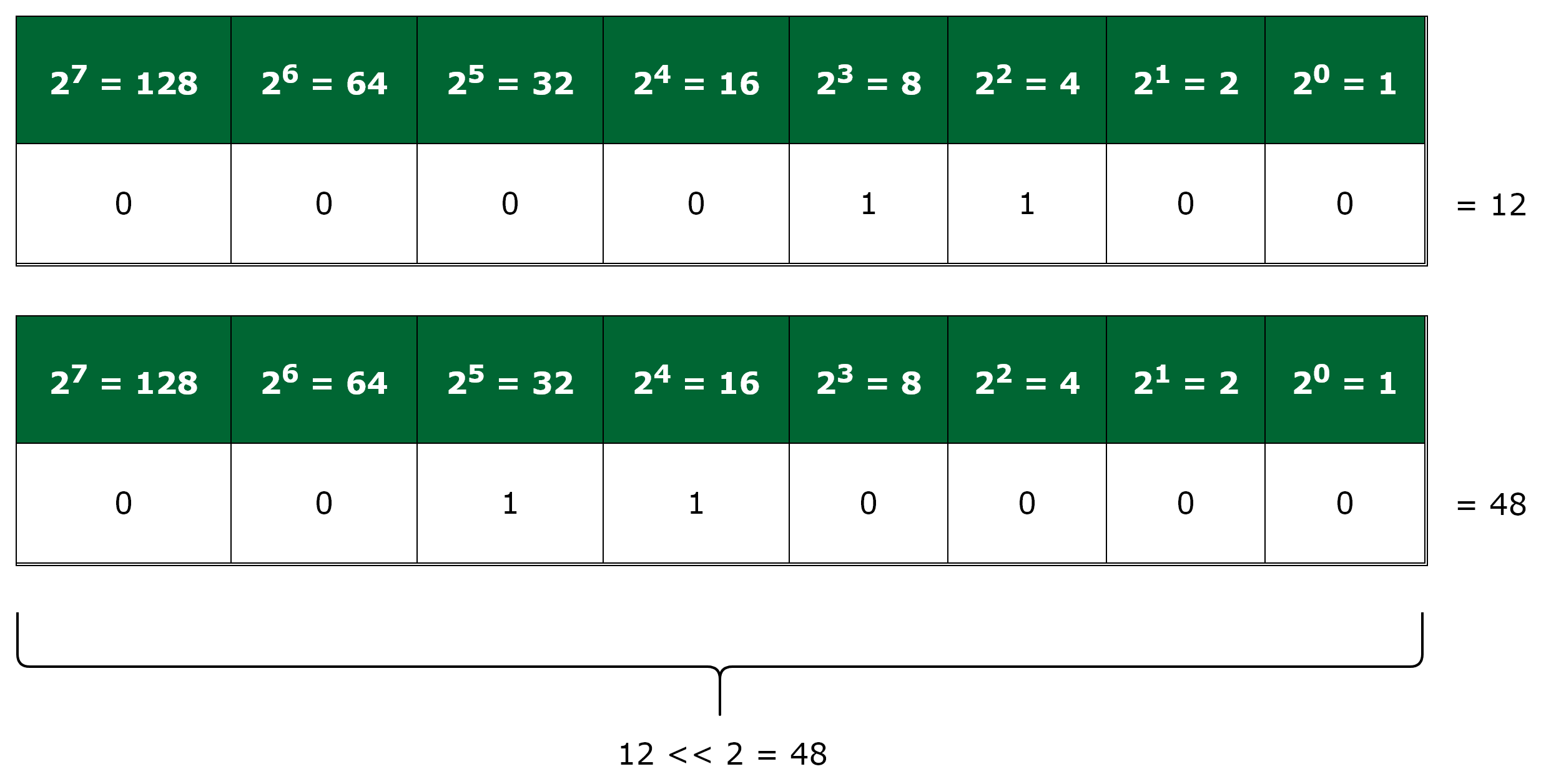 The bitwise zero fill left shift << operator also works with two operands. As the name suggests, it shifts all the bits of the first operand to the left by the number of bits specified in the second operand, with all the resultant empty spaces towards the right filled with 0. For example 12 << 2 = 48 as follows: